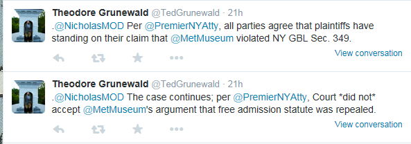 The plaintiffs claimed to be beneficiaries of the Met’s lease contract with the city of New York. A third party beneficiary is someone whom a contract contemplates will be benefitted in some way, and that person ordinarily has standing to bring a claim to enforce the contract (like the beneficiary of an insurance contract, for example). Since the city was not a party, and the court considered whether the plaintiffs even had standing to bring the claims as third-party beneficiaries. The Supreme (trial) Court found that they are not. Although the Met’s arrangement was clearly designed to benefit the public, that does not convert every member of the public into a third-party beneficiary.