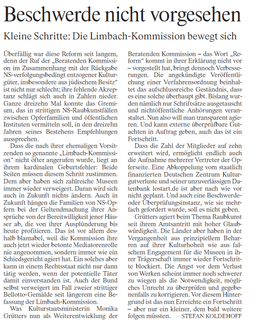 After nearly a year of hinting at changes the Advisory Commission in Germany that makes recommendations to state museums on claims for allegedly Nazi-looted works in their collections (“Beratende Kommission im Zusammenhang mit der Rückgabe NS-verfolgungsbedingt entzogener Kulturgüter, insbesondere aus jüdischem Besitz,” or “Advisory Commission on the return of cultural property seized as a result of Nazi persecution, especially Jewish property”), the federal government announced last week the addition of three new members. Yet despite public outcry over the outdated and opaque procedures of the commission (better known as the Limbach Commission, in reference to the late Jutta Limbach, presiding member and former judge of the Constitutional Court), none of the fundamental flaws in the panel have been confronted or addressed. Instead, the occasion has served as little more than another photo opportunity for federal Minister of Culture Monika Grütters, whose visage dutifully accompanies all the recent announcements.
