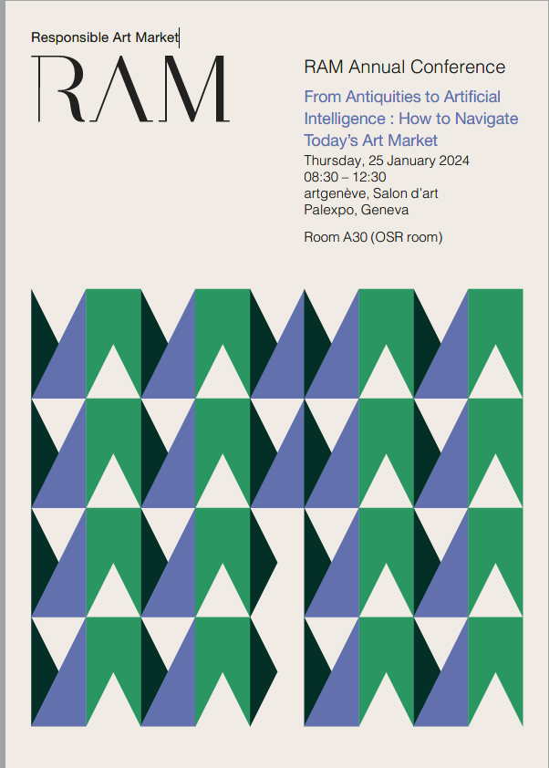 The Responsible Art Market Initiative will hold its annual conference next week in Geneva on January 25, 2024 (Thursday) at the art fair artgenève. RAM, which has increasingly been recognized as an industry leader in best practices in the art market, will present a keynote speaker and two discussion panels (one of which I will chair). The program and registration are available here.