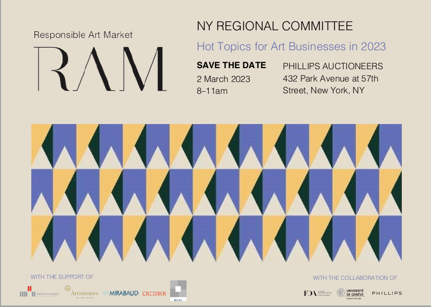 On the heels of another successful annual conference in Geneva last week, I am very pleased to announce that the Responsible Art Market Initiative will be hosting its first New York Chapter event on Thursday morning, March 2, 2023 at Phillips Auctioneers on Park Avenue. Registration will be opened soon, but two panels will discuss sustainability issues in the market, and the ever-changing challenges and opportunities presented by NFTs. We are grateful to Phillips for welcoming us to their beautiful space, where we will have a chance after the event to see the art on view for auction. Join us for RAM's unique blend of real-world art market practitioners and experts, and a chance to get together.