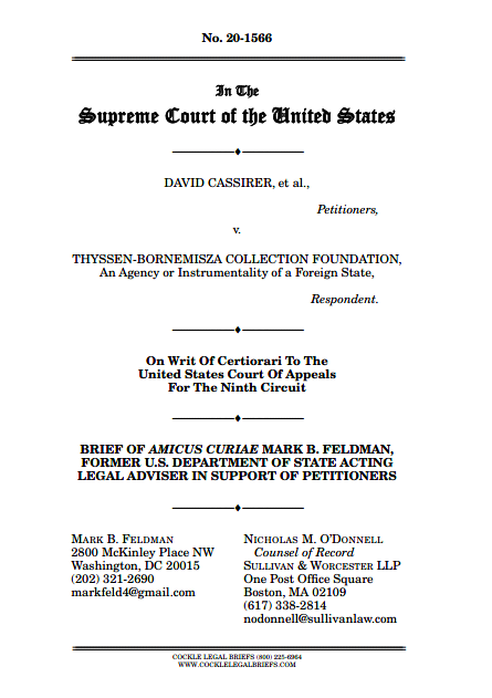 Today I am pleased to announce that I have filed a brief in the Supreme Court of the United States as counsel of record for amicus curiae Mark B. Feldman, former U.S. Department of State Acting Legal Adviser. We filed the brief in the case of Cassirer et al. v. Thyssen-Bornemisza Collection Foundation (“TBC”). Cassirer is the long-running dispute over title to Rue St. Honoré, après-midi, effet de pluie (Rue St. Honoré, Afternoon, Rain Effect) by Impressionist painter Camille Pissarro. The painting once belonged to Lilly Cassirer, a Jewish woman in Berlin in 1939, from whom Nazi agents “bought” the painting. The case before the Supreme Court is not about whether the painting was stolen—it is undisputed that it was. Rather, the Supreme Court will review the Ninth Circuit’s decision that Spanish law, not California law, should govern the ownership rights.